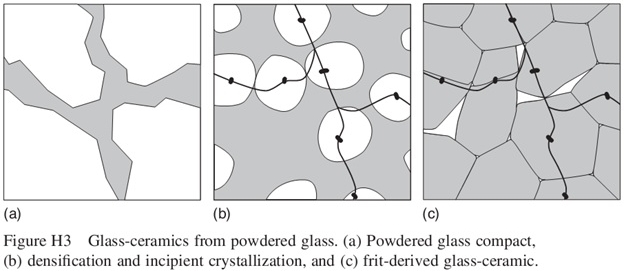 Trong những năm gần đây, một phương pháp sản xuất gốm thủy tinh đã được chứng minh là khả thi về mặt kỹ thuật và thương mại. Phương pháp này liên quan đến việc kết tinh và kết khối từ bột thủy tinh. Cách tiếp cận này có các tiến bộ nhất định với việc kết tinh dạng khối. Bước đầu tiên, quá trình sản xuất gốm thủy tinh truyền thống được áp dụng như: đổ khuôn, tạo áp và đùn ép. Bước thứ hai, bởi vì vận tốc dòng là cao trước quá trình kết tinh, gốm thủy tinh sẽ bao phủ bề mặt kim loại hoặc bề mặt gốm khác. Bước cuối cùng, cũng là bước quan trọng nhất, là sử dụng các bề mặt chưa hoàn chỉnh để tạo thành các vị trí tạo mầm. Quá trình này đặc biệt liên quan đến việc nghiền các mảnh kính vừa tạo ra thành các hạt có kích cỡ từ (3-15)µm. Bột này được tạo hình bằng kỹ thuật tạo hình trong độ nhớt, ở đó việc kết khối chỉ thực sự hoàn thành ngay sau khi việc kết tinh hoàn toàn kết thúc. Khám phá thương mại đầu tiên là frit- 1 dẫn xuất của gốm thủy tinh được sử dụng như là chất hàn để hàn các bóng hình. Ngày nay, công nghệ được áp dụng sản xuất các vật chất đối lớp, đa lớp cho việc bao gói điện tử.